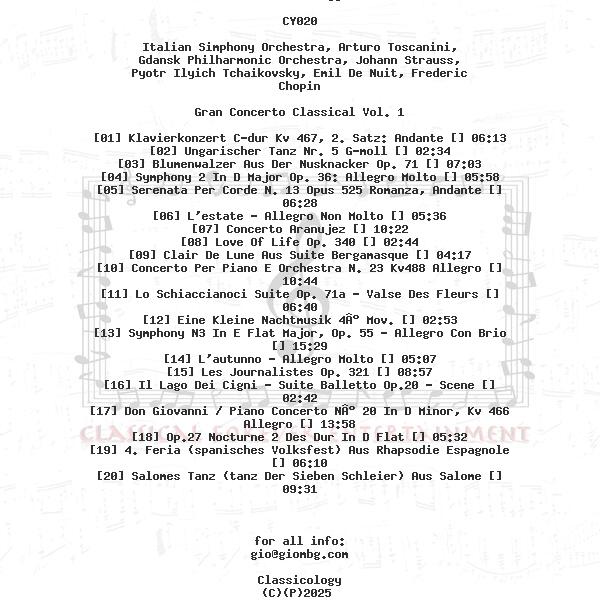 Italian Simphony Orchestra, Arturo Toscanini, Gdańsk Philharmonic Orchestra, Johann Strauss, Pyotr Ilyich Tchaikovsky, Emil De Nuit, Frederic Chopin, Wolfgang Amadeus Mozart, Johannes Brahms, Ludwig Van Beethoven, Antonio Vivaldi, Rodrigo Joaquin, Claude Debussy, Maurice Ravel, Richard Strauss