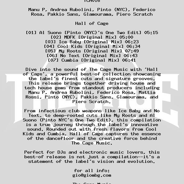 Dive into the sound of The Cage Music with 'Hall of Cage', a powerful best-of collection showcasing the label’s finest cuts and signature grooves. This release brings together driving house and tech house gems from standout producers including Manu P, Andrea Rubolini, Federico Rosa, Mattia Rossi, Pinto (NYC), Pakkio Sans, Glamourama, and Piero Scratch.